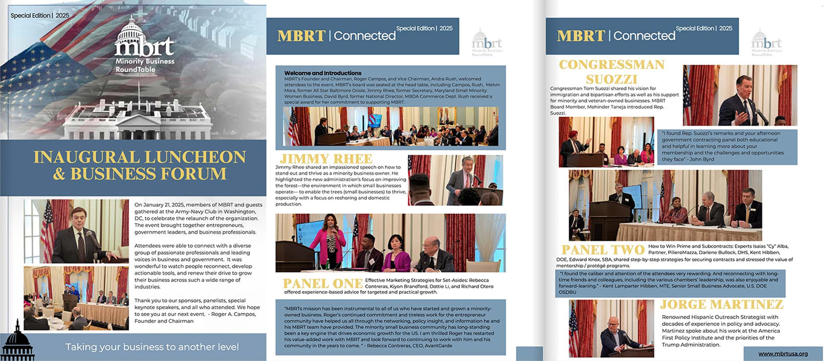 Thank for arranging an unbelievably beneficial and informative event. All of the speakers and panelists were outstanding. It speaks volumes to the invaluable information and access to seasoned professionals in government contracting that one can experience through an MBRT event. “Thanks again for your tireless efforts for the members of the MBRT!